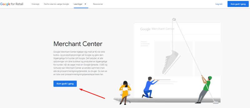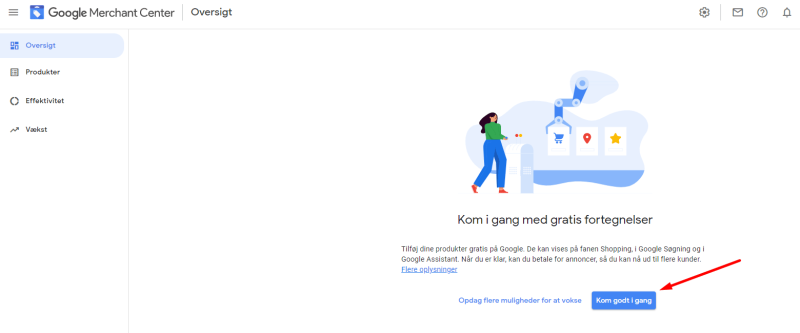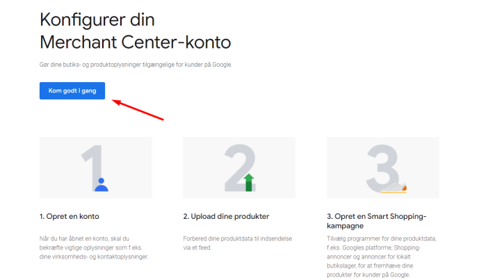 Hvis ikke du har Google Merchant Center og er logget ind på din Google Konto, så burde du ca. have nedenstående visning, hvor du skal trykke på Kom godt i gang: