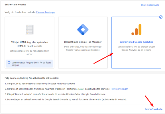 Bekræft med Google Analytics, som er muligheden længst til højre. Tryk derefter på Bekræft website i højre hjørne, som vist nedenfor.