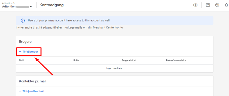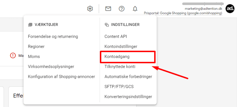 Herfra kan du nu give Adtention adgang til din Google Merchant Center.