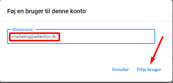 Indtast mailen marketing@adtention.dk, som vist nedenfor og tryk Tilføj bruger.