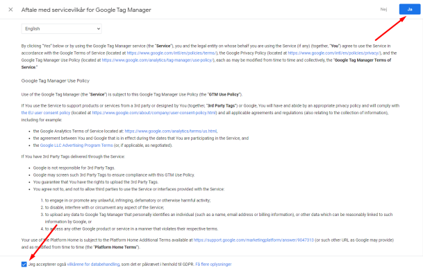 Accepter servicevilkår for Google Tag Manager og tryk Ja, som vist nedenfor.