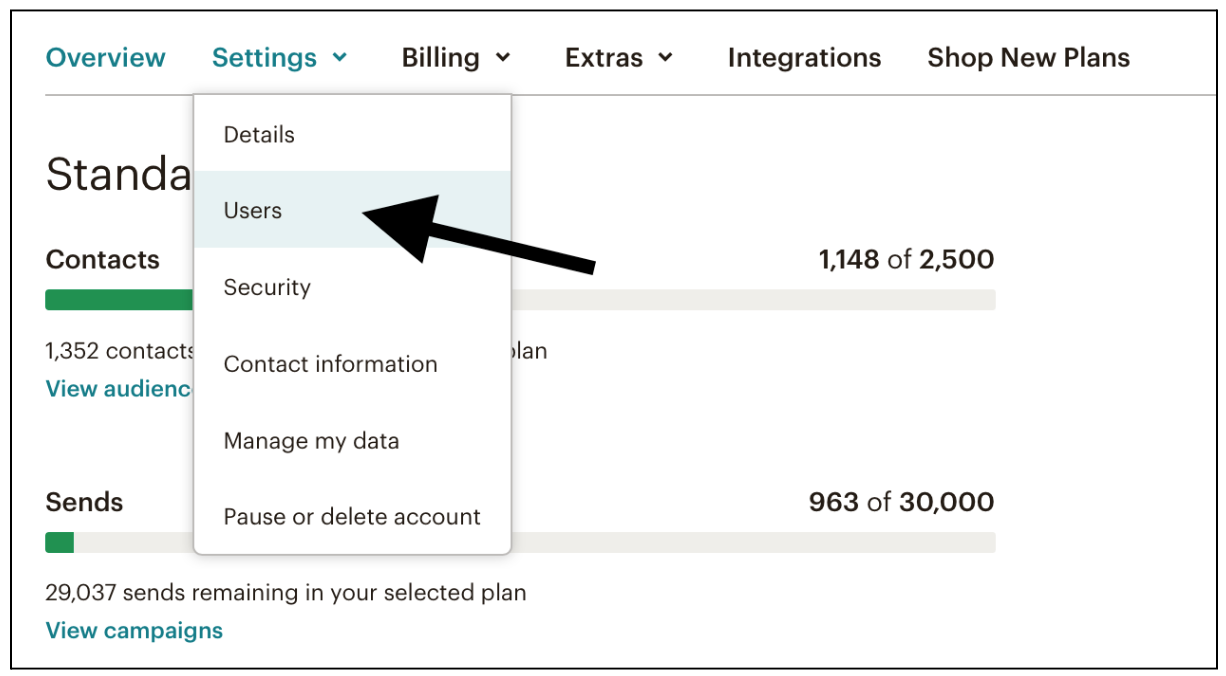 Her trykker du på Settings, hvorefter du klikker på Users i rullemenuen, som vist nedenfor.