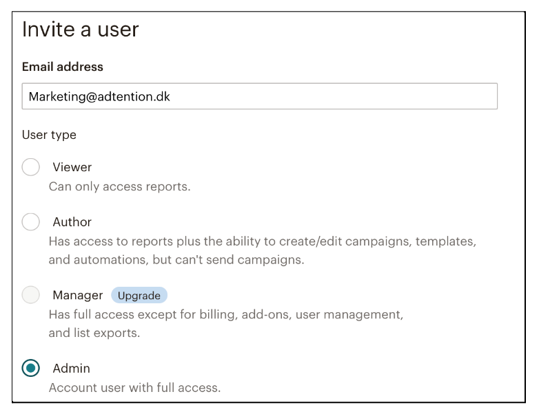 Har du ikke en MailChimp konto? Tag fat i din kontaktperson hos Adtention, som kan hjælpe dig med at oprette en.